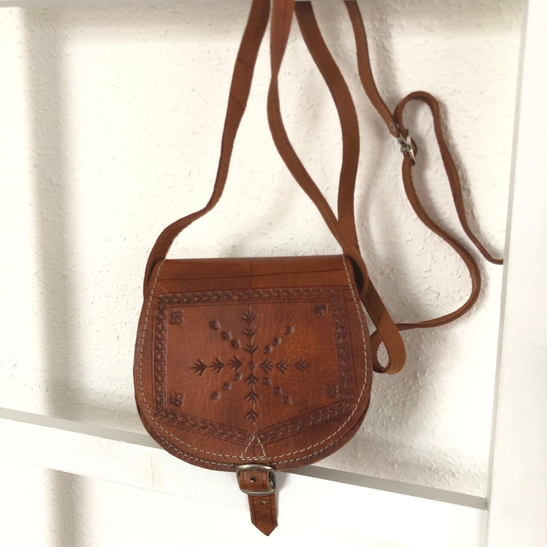 Deze hippie leather bag komt van Ibiza, deze is geheel leder, draagband is makkelijk verstelbaar, de tas sluit dmv kleine gesp-sluiting. Afmeting: 14,5 x 13 x 3,5 cm.