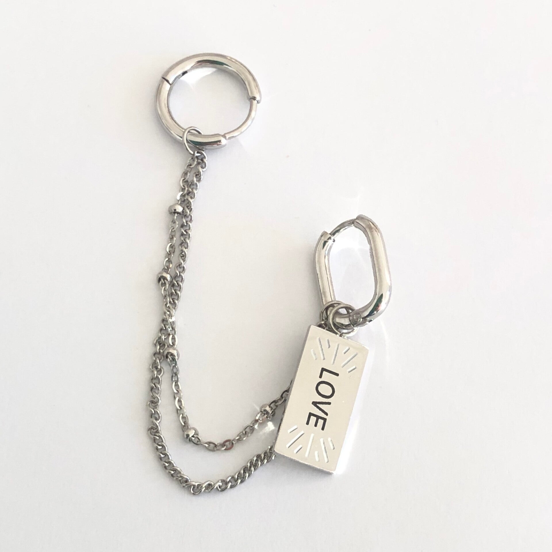 Oorbellen set, deze draag je naast mekaar in hetzelfde oor, in 2 gaatjes naast mekaar. Verbonden door het kettinkje en bedel: love