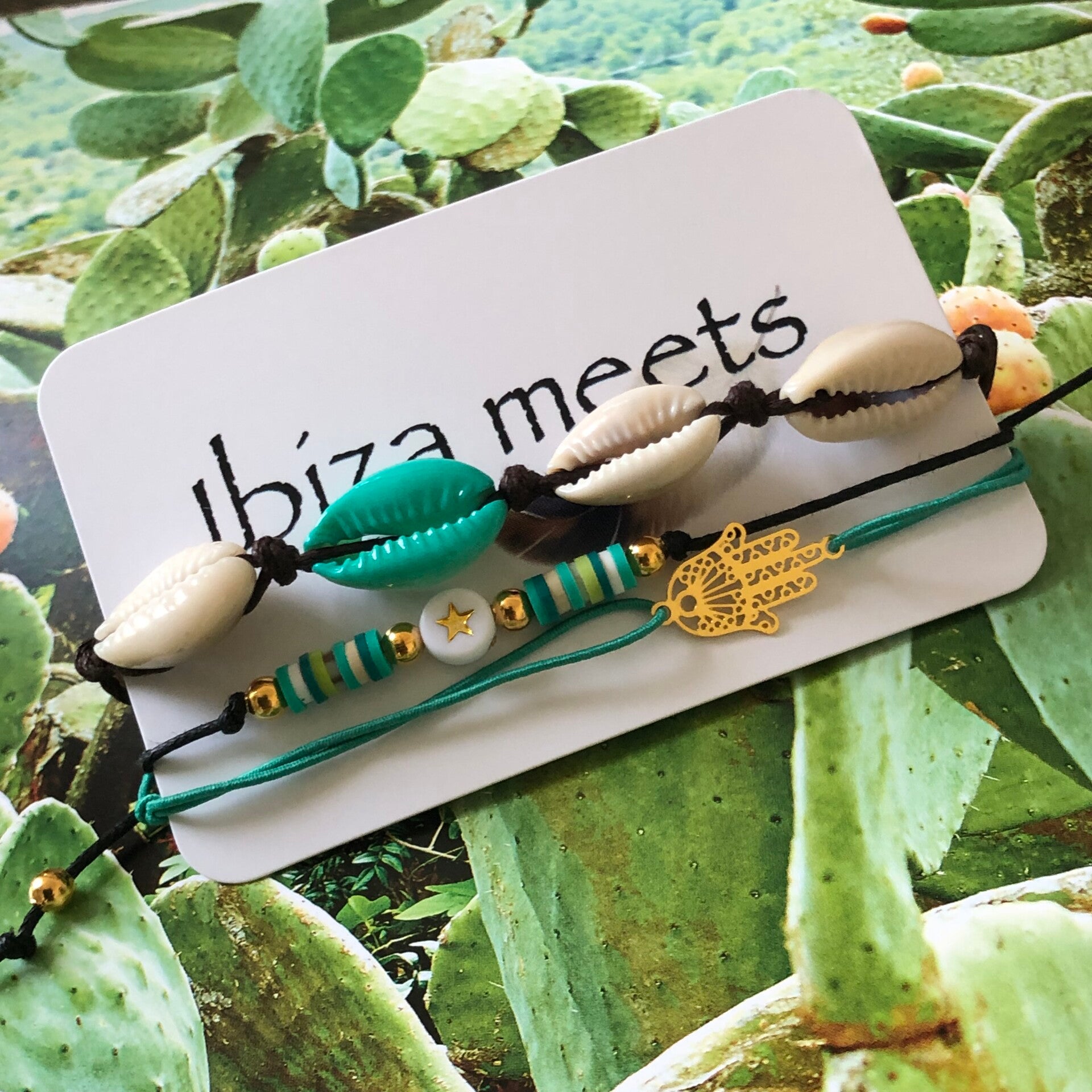 Deze set van 3 armbandjes, bestaat uit een kauri schelpen armband, een elastisch groen bandje met goudkleurig hamsa handje en een katsuki armband met ster bedel. Ieder armbandje is handgemaakt en eigen ontwerp van Ibiza meets. Deze set is vrijwel door ieder te dragen.