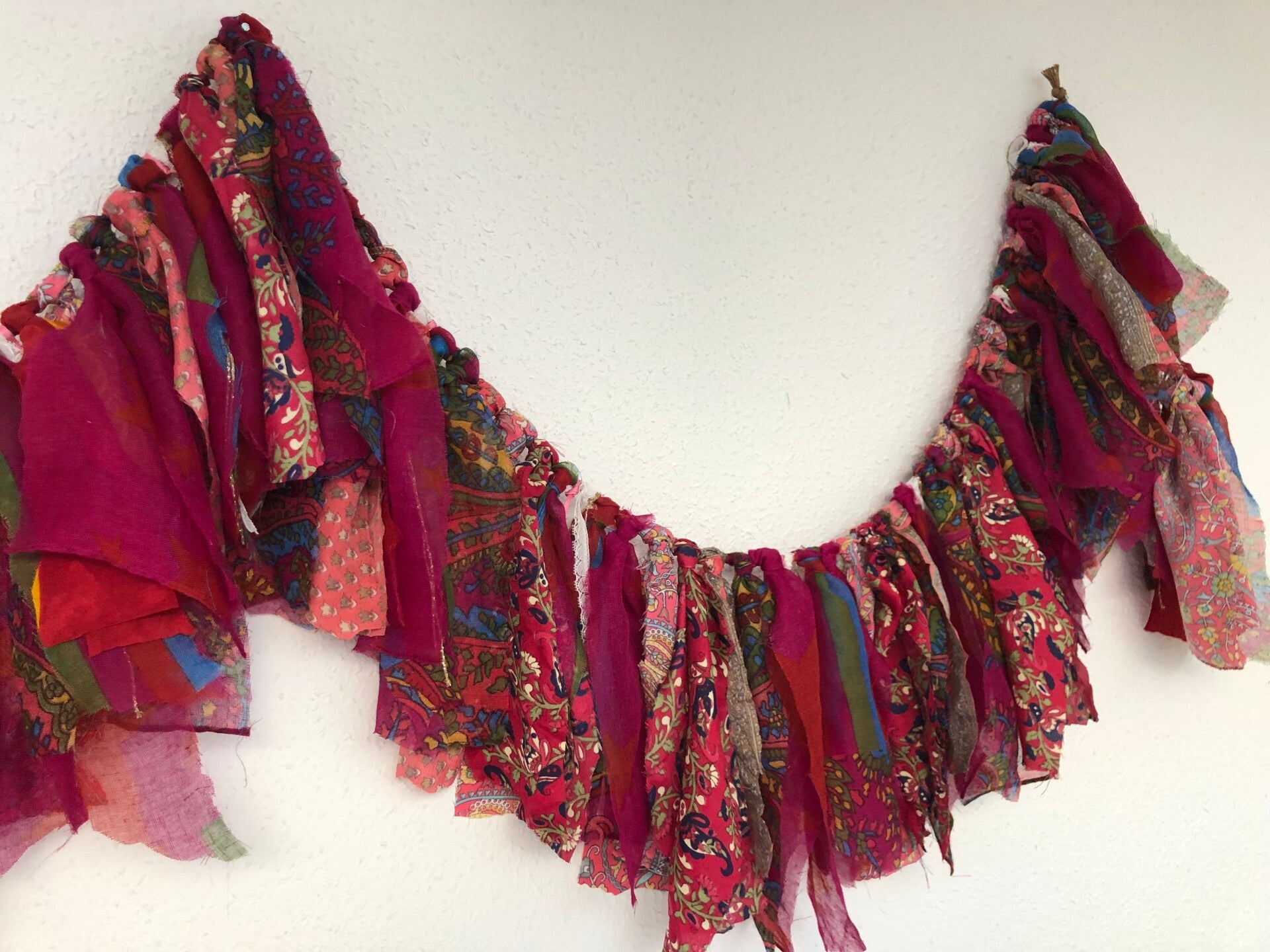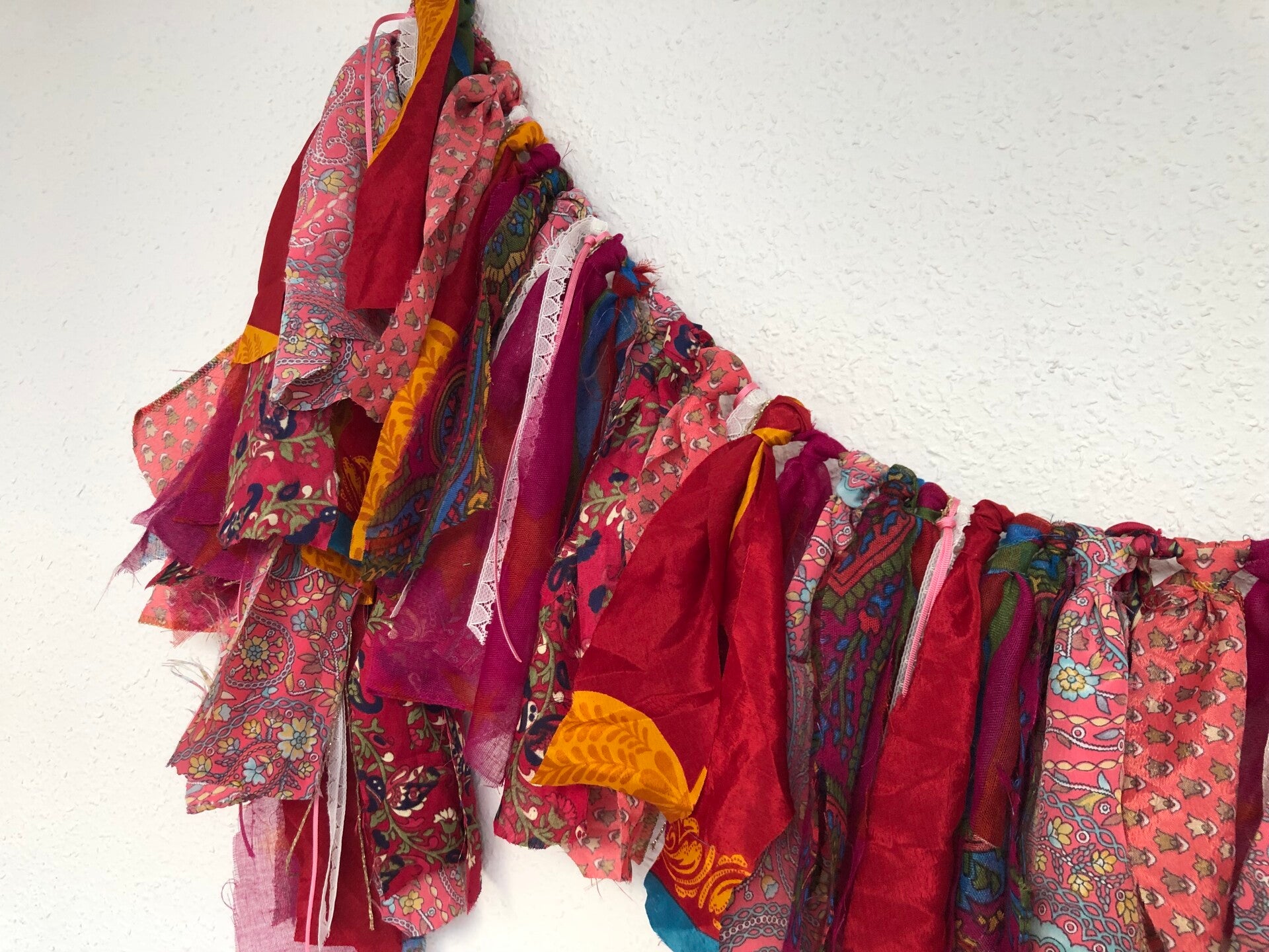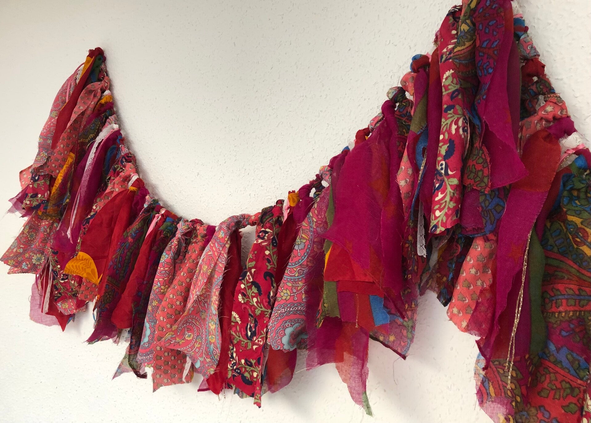 Deze guirlande is gemaakt van coupons sari's, rest-stoffen, sjaals