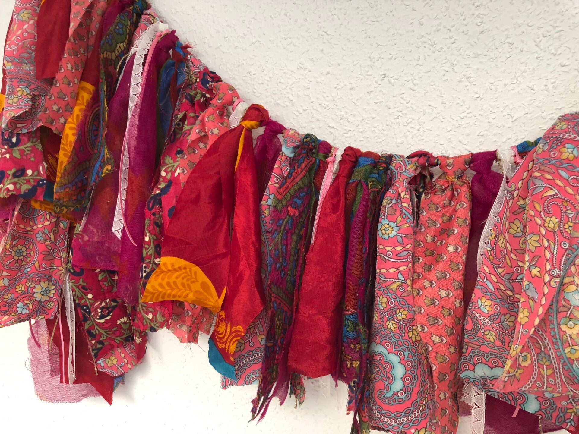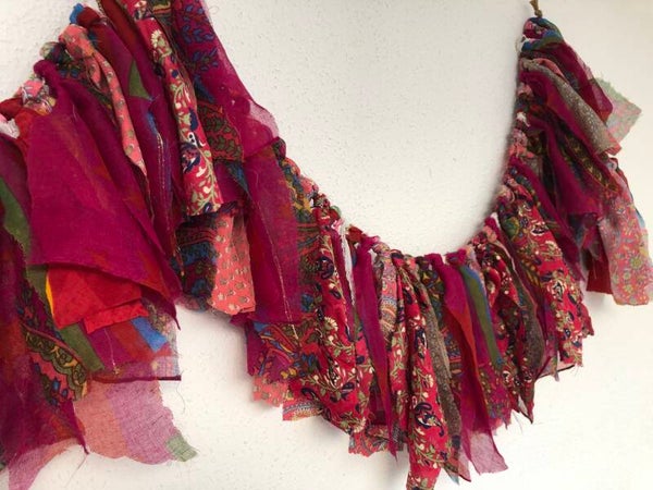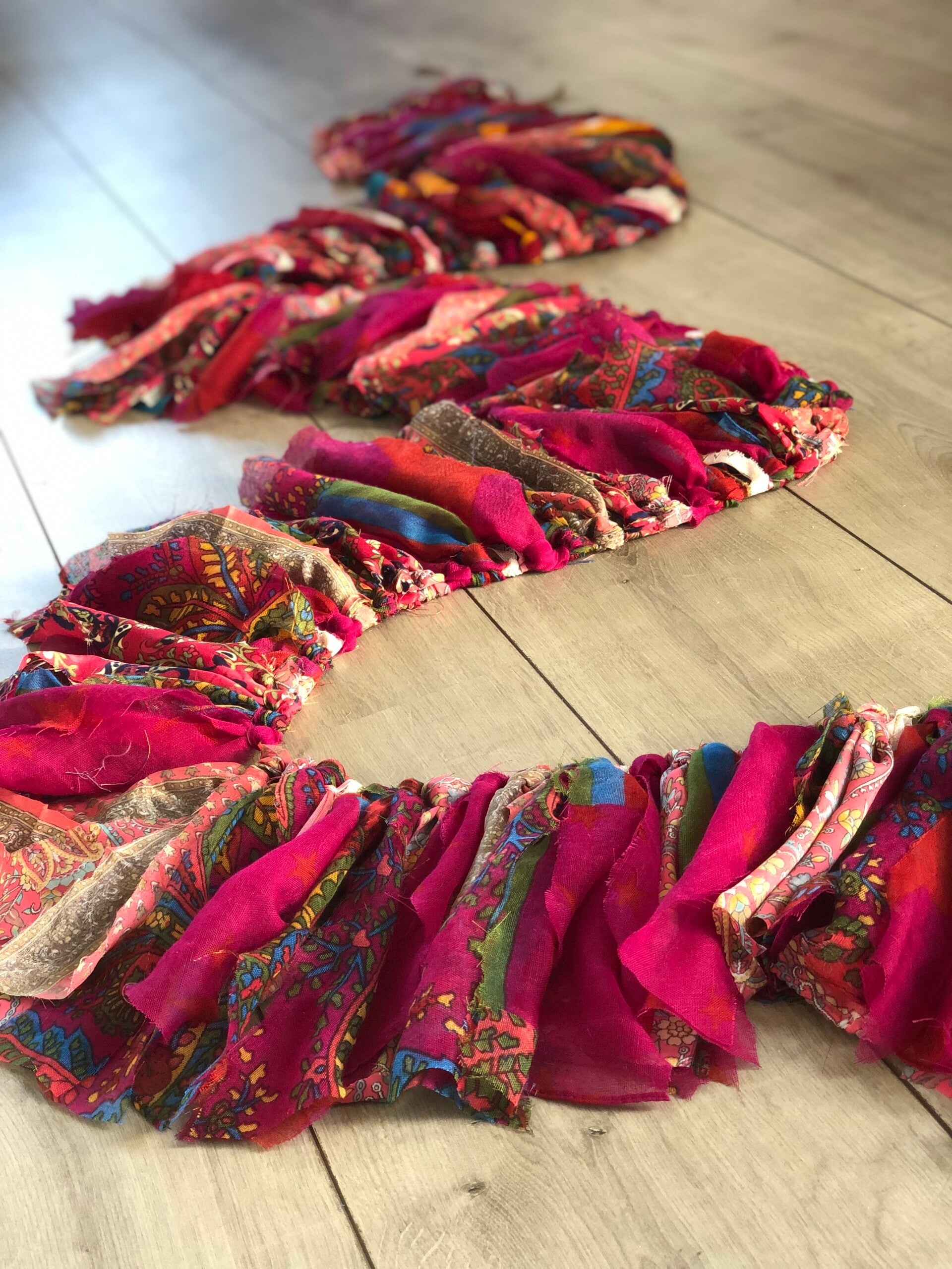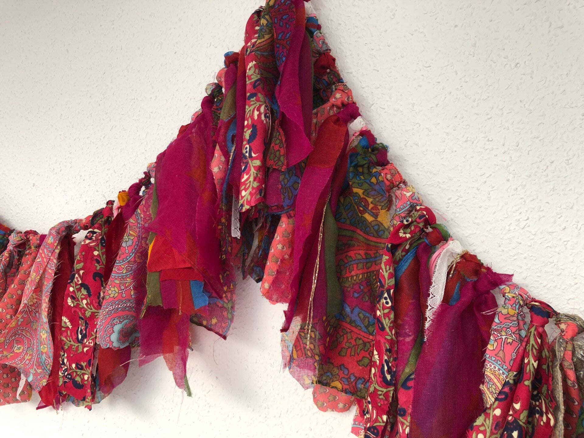 Deze guirlande is gemaakt van coupons sari's, rest-stoffen, sjaals