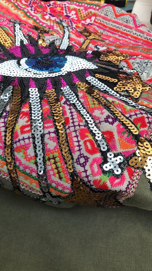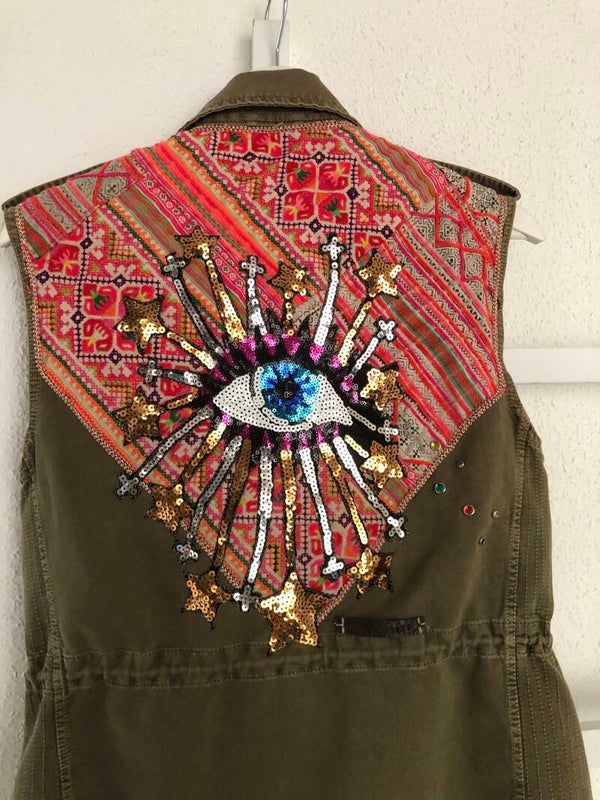 Up-cycled army gilet Hmong, stars & eyes