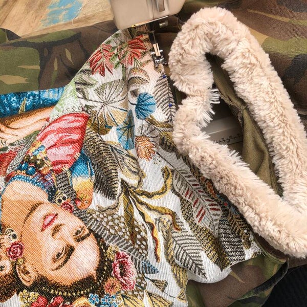 Exclusief is dit up-cycled original army jack, hiervan is er maar 1, ontworpen en gemaakt in eigen atelier. Mooi paneel op de rug van Frida Kahlo.