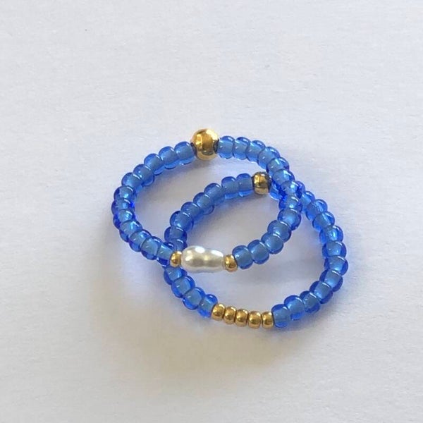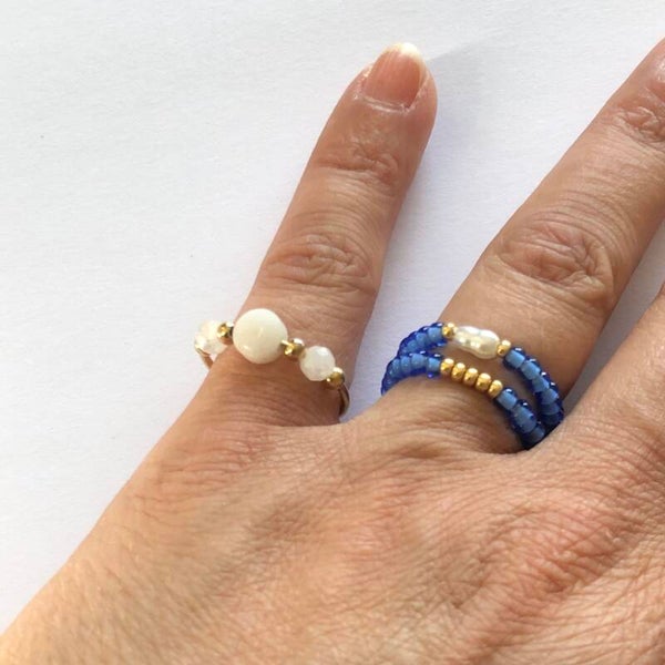 Eigen ontwerp en handgemaakt in het atelier van Ibiza meets. Tsjechische glaskralen geregen op elastiek, waardoor deze ring vrijwel iedereen past.