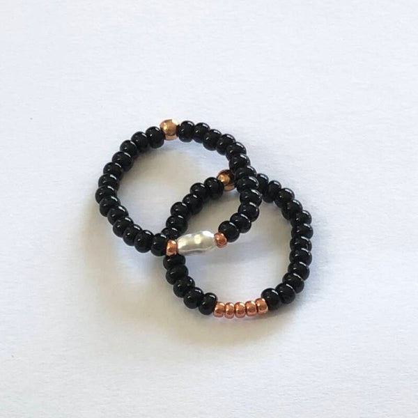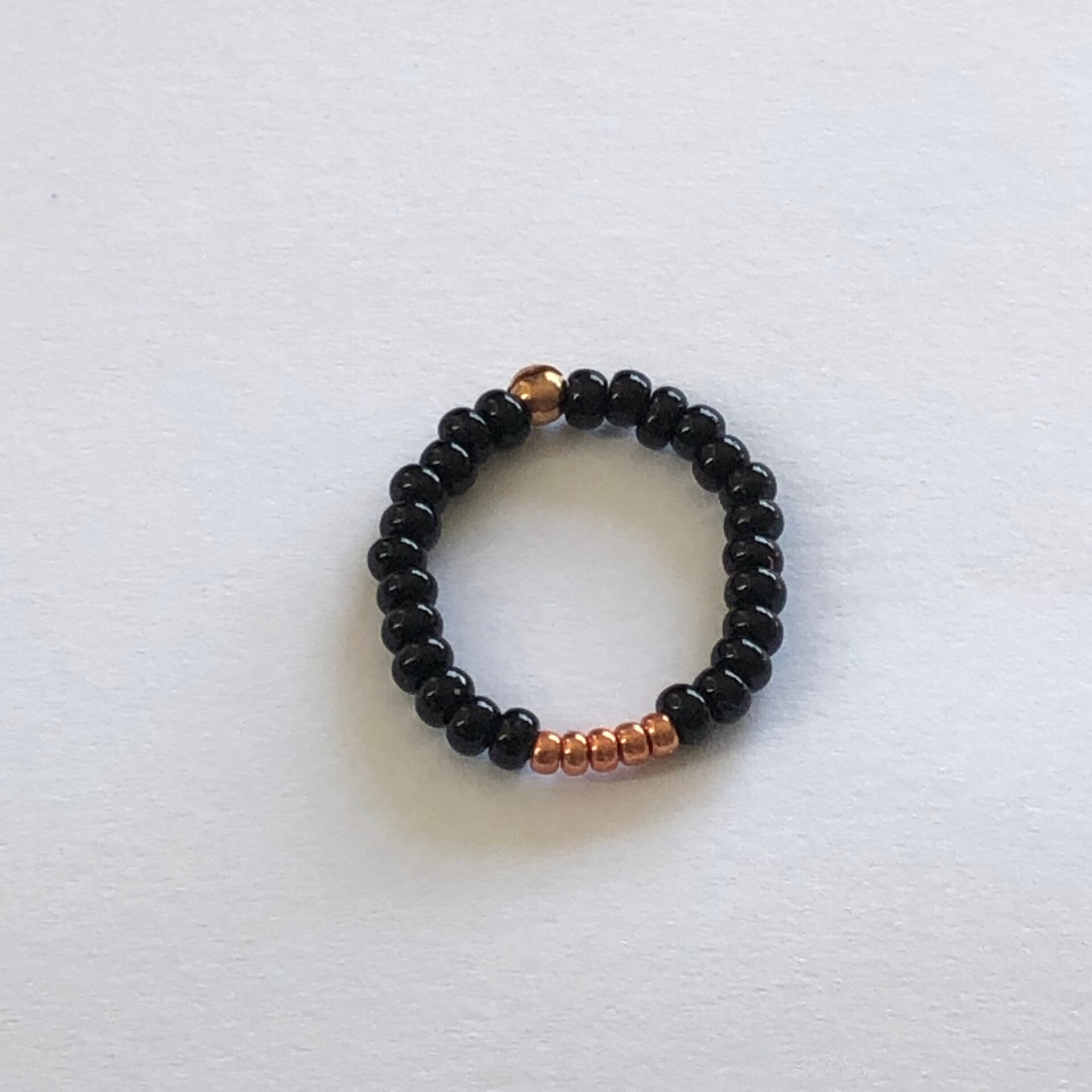 Eigen ontwerp en handgemaakt in het atelier van Ibiza meets. Tsjechische glaskralen geregen op elastiek, waardoor deze ring vrijwel iedereen past.