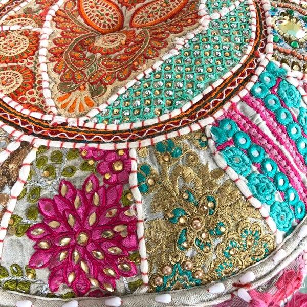 Iedere poef is weer anders, dat maakt het zo leuk. Mooie bewerkte stoffen met randjes en kraaltjes, spiegeltjes, pailletten.