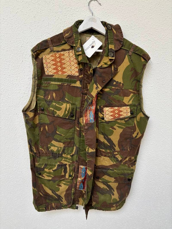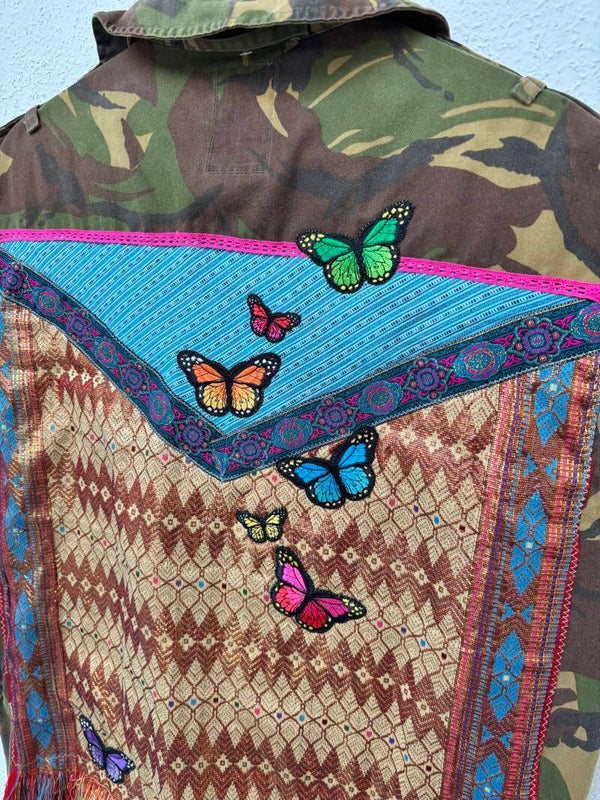 Exclusief is dit up-cycled army gilet, hiervan is er maar 1, ontworpen en gemaakt in eigen atelier. Gave applicatie van stof uit Ibiza, schittert in de zon echt als goud, met turquoise stoffen gecombineerd, sierband en vlinder applicaties. Voorzien van afsluitbare zakken.