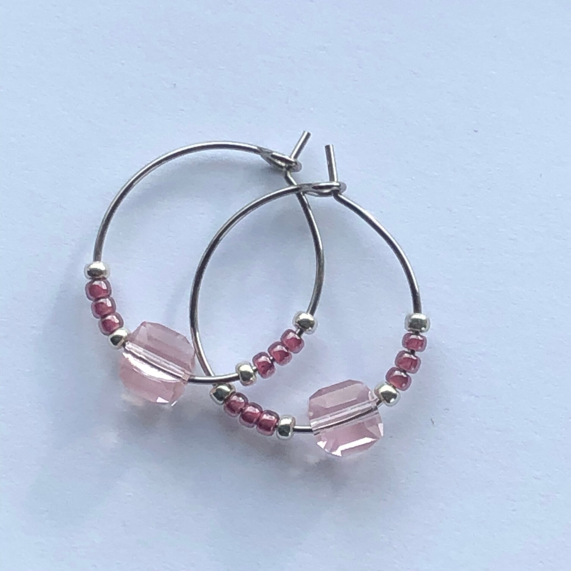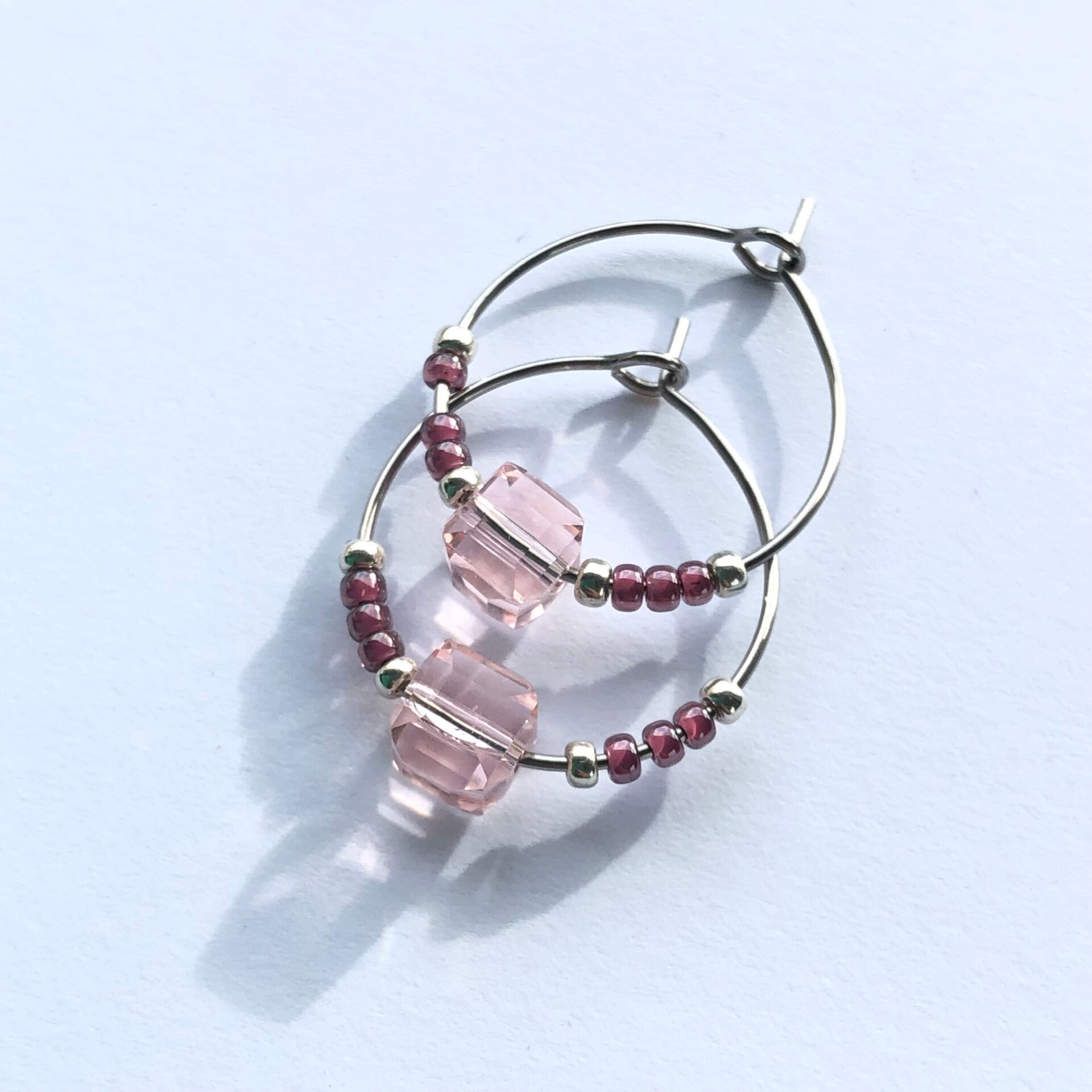 Stainless steel loop earring met Tsjechische glaskralen en miyuki-kralen. Eigen ontwerp, handgemaakt.