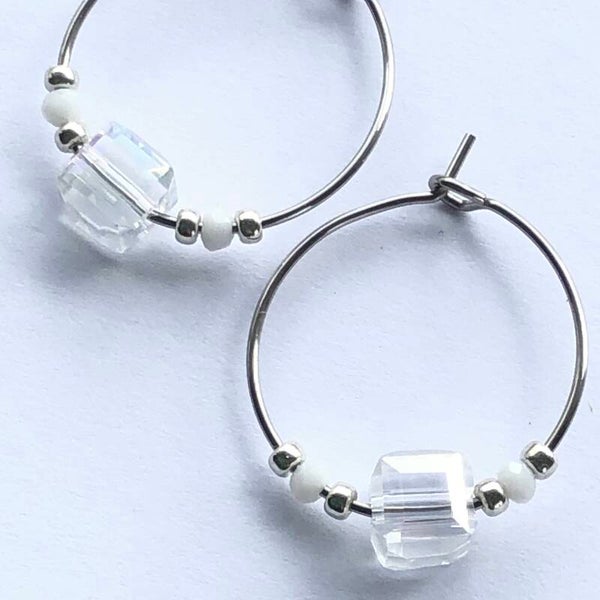 Stainless steel loop earring met Tsjechische glaskralen en miyuki-kralen. Eigen ontwerp, handgemaakt.